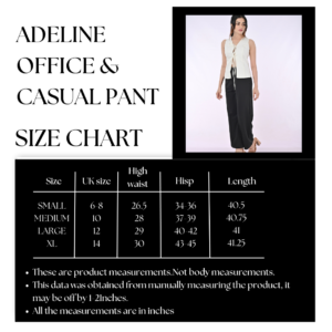 •Available In Black. •Wide Leg Pant •Slightly Stretch •2 Pocket •12″ High Rise •28″ Inseam •Model UK8 – Wearing size Small